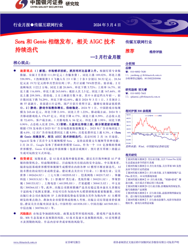【银河证券】【20240304】传媒互联网行业2月行业月报:Sora和Genie相继发布,相关AIGC技术持续迭代-36页 行业研究