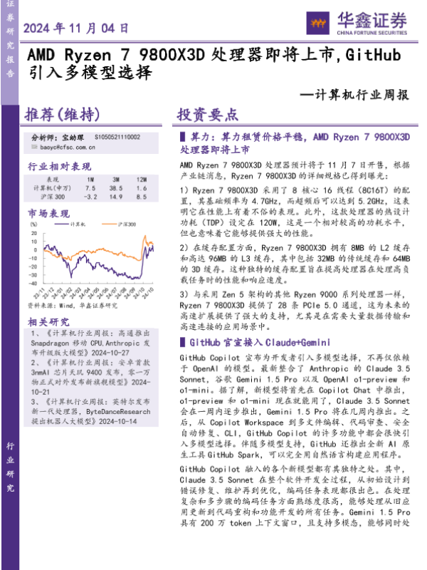 【华鑫证券】【20241104】20241104-华鑫证券-计算机行业周报:AMD Ryzen 7 9800X3D处理器即将上市,GitHub引入多模型选择-16页 行业研究