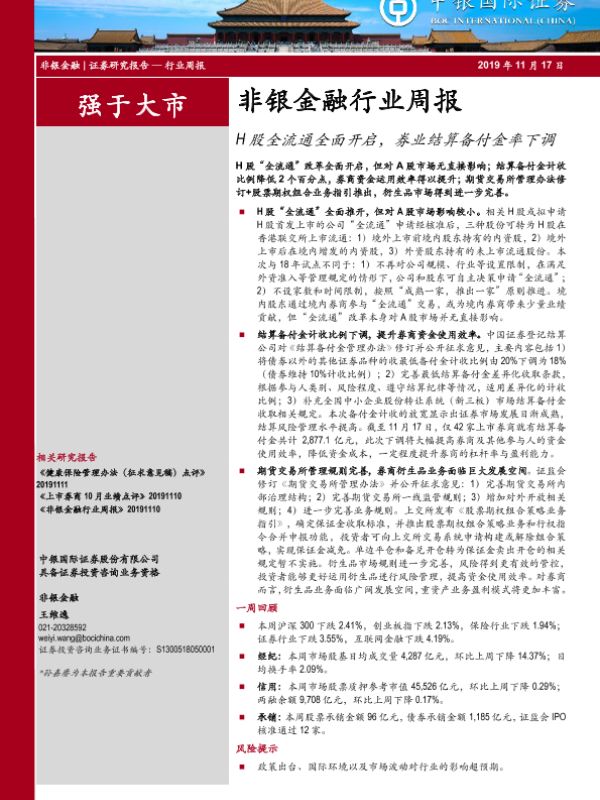 【中银证券】【20191117】非银金融行业周报:H股全流通全面开启,券业结算备付金率下调-12页 行业研究