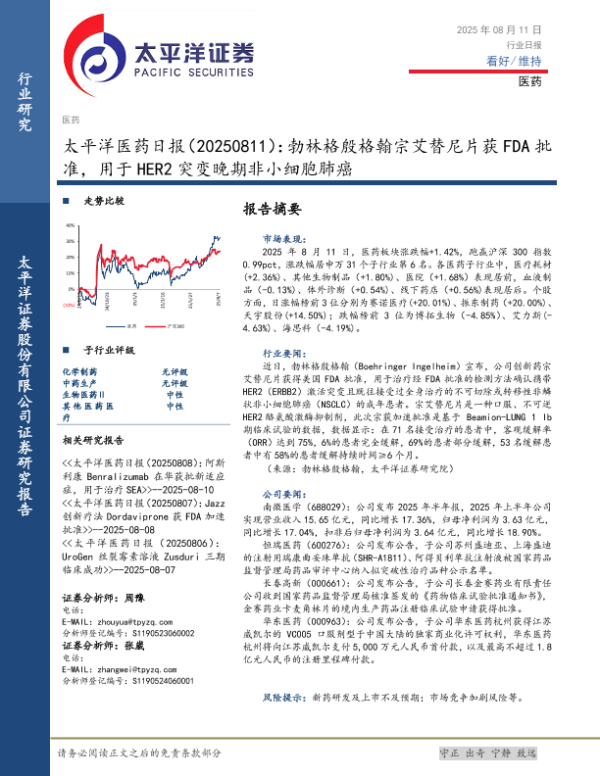 【太平洋证券】【20250811】医药行业日报:勃林格殷格翰宗艾替尼片获FDA批准,用于HER2突变晚期非小细胞肺癌-3页 行业研究