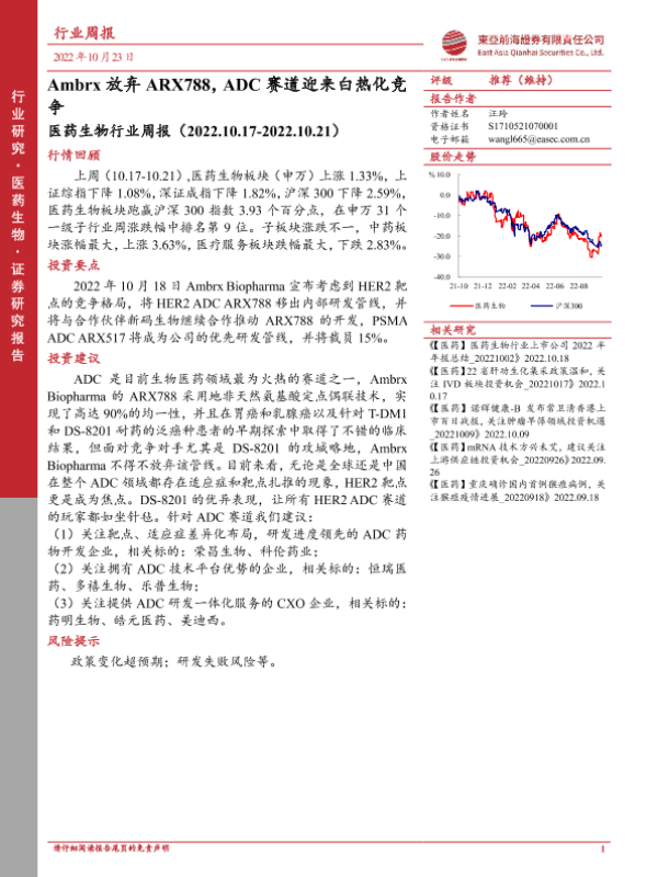 【东亚前海证券】【20221023】医药生物行业周报:Ambrx放弃ARX788,ADC赛道迎来白热化竞争-11页 行业研究