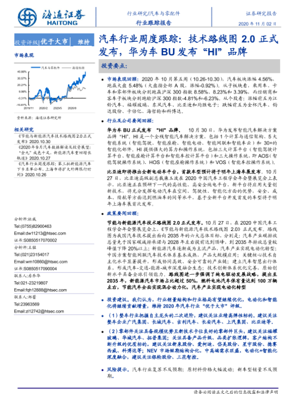 【海通证券】【20201102】20201102-海通证券-汽车行业周度跟踪:技术路线图2.0正式发布,华为车BU发布“HI”品牌-4页 行业研究