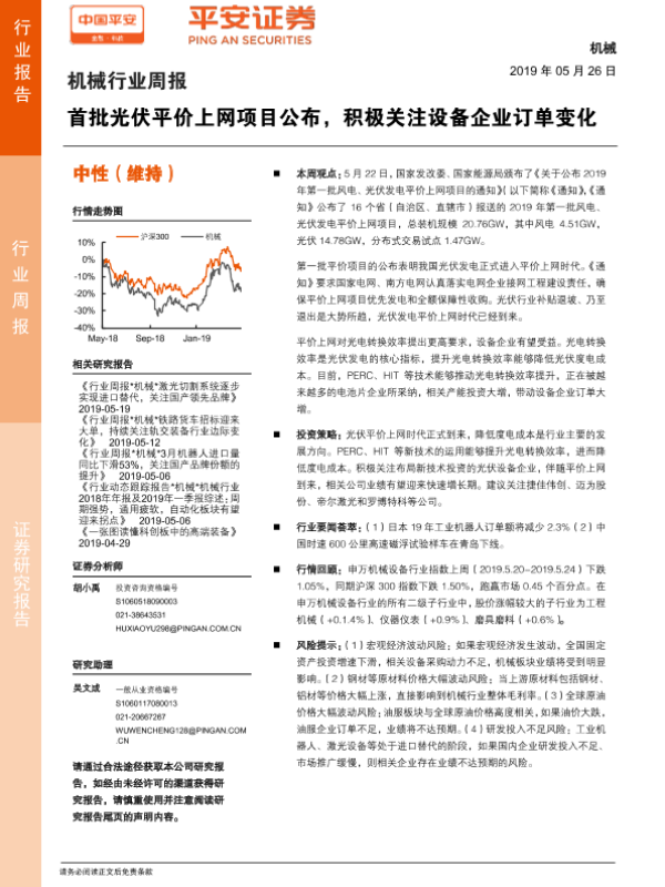 【平安证券】【20190526】机械行业周报:首批光伏平价上网项目公布,积极关注设备企业订单变化-4页 行业研究