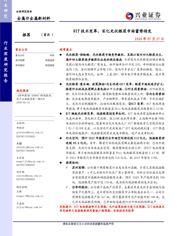 【兴业证券】【20200727】HIT技术变革,百亿光伏银浆市场蓄势待发-27页 行业研究