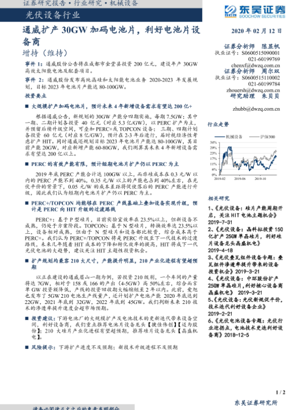 【东吴证券】【20200212】光伏设备行业:通威扩产30GW加码电池片,利好电池片设备商-2页 行业研究