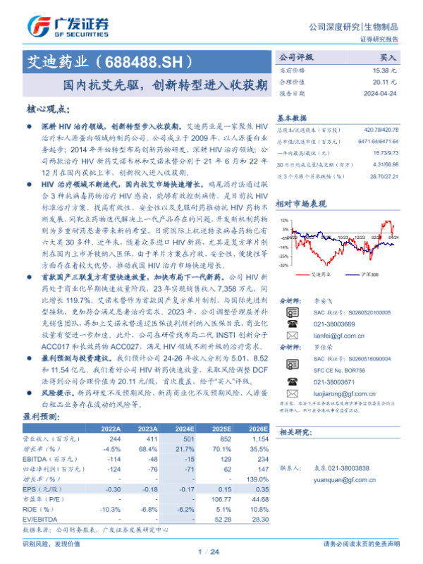 【广发证券】【20240424】艾迪药业(688488)国内抗艾先驱,创新转型进入收获期-24页 行业研究