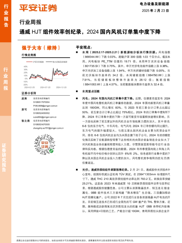 【平安证券】【20250223】电力设备及新能源行业周报:通威HJT组件效率创纪录,2024国内风机订单集中度下降-21页 行业研究