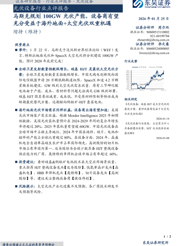 【东吴证券】【202601】光伏设备:硅基 HJT是太空光伏的最优方案,看好设备商受益于太空光伏历史性机遇-2页 证券期货研究报告