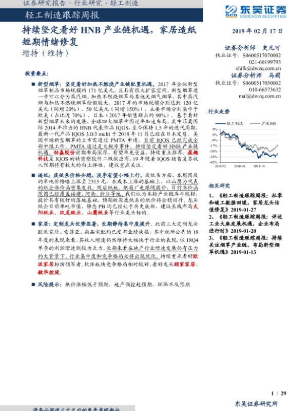 【东吴证券】【20190217】20190217-东吴证券-轻工制造跟踪周报:持续坚定看好HNB产业链机遇,家居造纸短期情绪修复-29页 行业研究