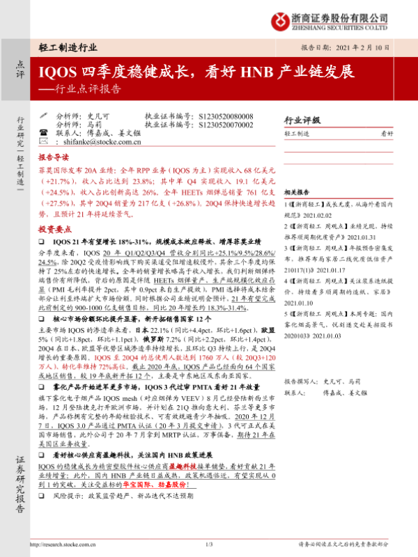 【浙商证券】【20210210】轻工制造行业点评报告:IQOS四季度稳健成长,看好HNB产业链发展-3页 行业研究