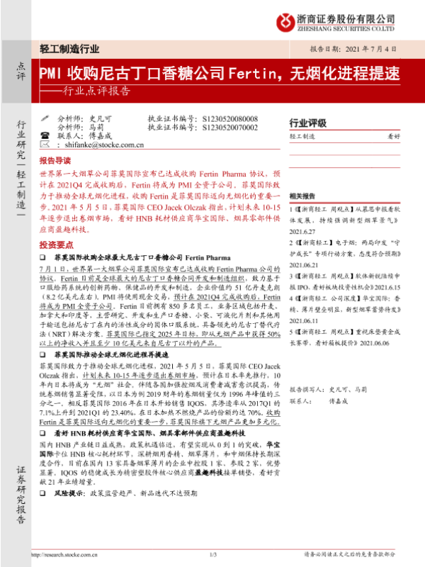 【浙商证券】【20210704】PMI收购尼古丁口香糖公司Fertin,无烟化进程提速-3页 行业研究