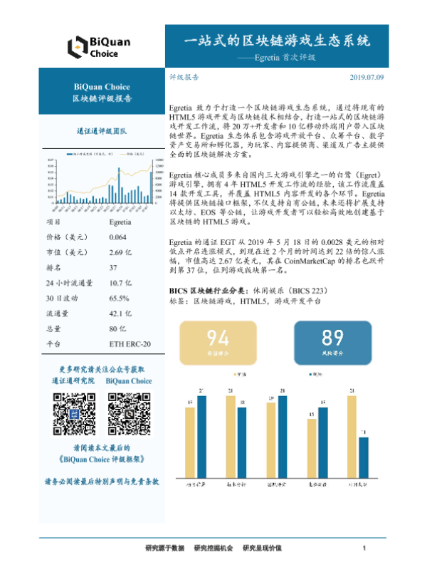 【通证通研究院】【20190709】一站式的区块链游戏生态系统——Egretia首次评级-3页 行业研究