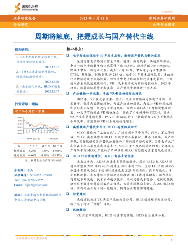 【湘财证券】【20230111】20230111-湘财证券-电子行业深度:周期将触底,把握成长与国产替代主线-24页 行业研究