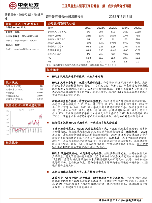 【中泰证券】【20230808】开勒股份(301070)工业风扇龙头进军工商业储能,第二成长曲线弹性可期-38页 行业研究