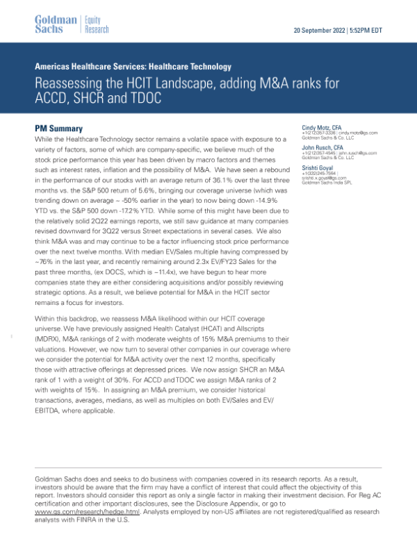 【Goldman Sachs】【20220920】Reassessing the HCIT Landscape, adding M&A ranks for ACCD, SHCR and TDOC-22页 行业研究
