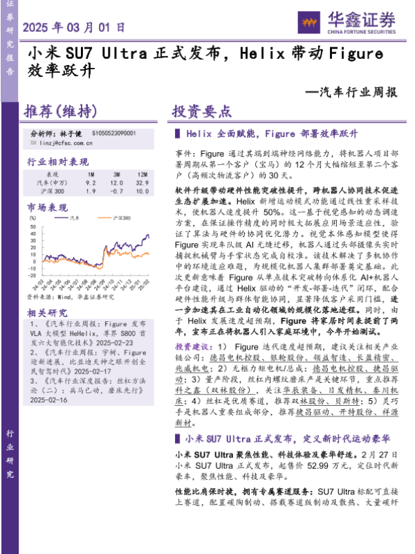 【华鑫证券】【20250302】2025-03-02-华鑫证券-汽车行业周报:小米SU7Ultra正式发布,Helix带动Figure效率跃升-18页 行业研究