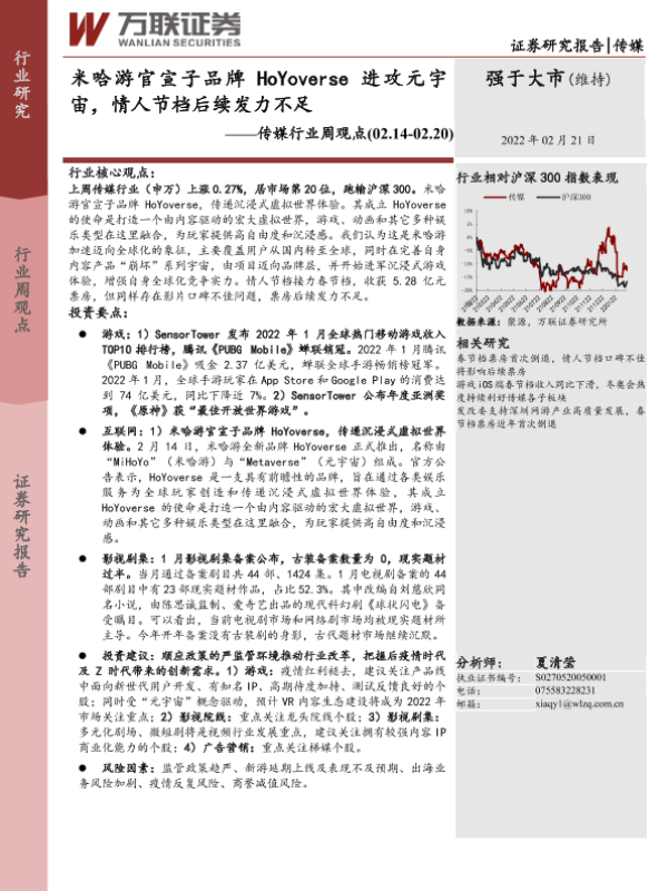 【万联证券】【20220221】米哈游官宣子品牌HoYoverse进攻元宇宙,情人节档后续发力不足-13页 行业研究