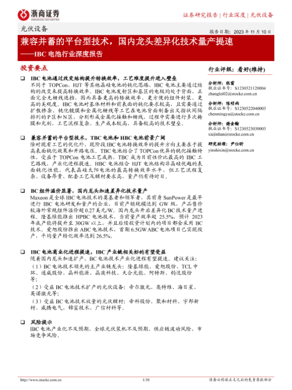 【浙商证券】【20231110】IBC电池行业深度报告:兼容并蓄的平台型技术,国内龙头差异化技术量产提速-30页 行业研究