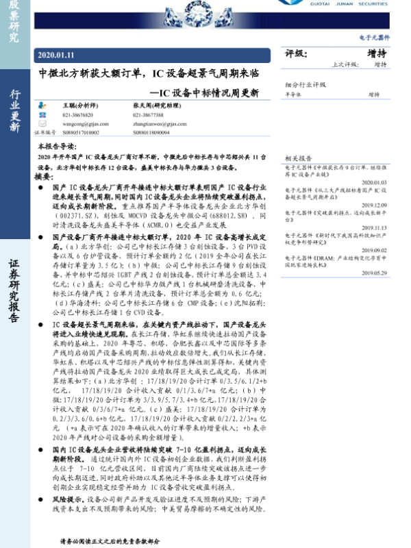 【国泰君安证券】【20200111】20200111-国泰君安-电子元器件:IC设备中标情况周更新-中微北方斩获大额订单,IC设备超景气周期来临-4页 行业研究