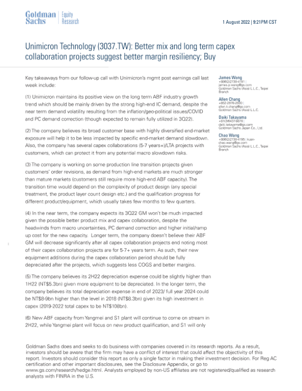 【Goldman Sachs】【20220801】g term capex collaboration projects suggest better margin resiliency; Buy-9页 行业研究