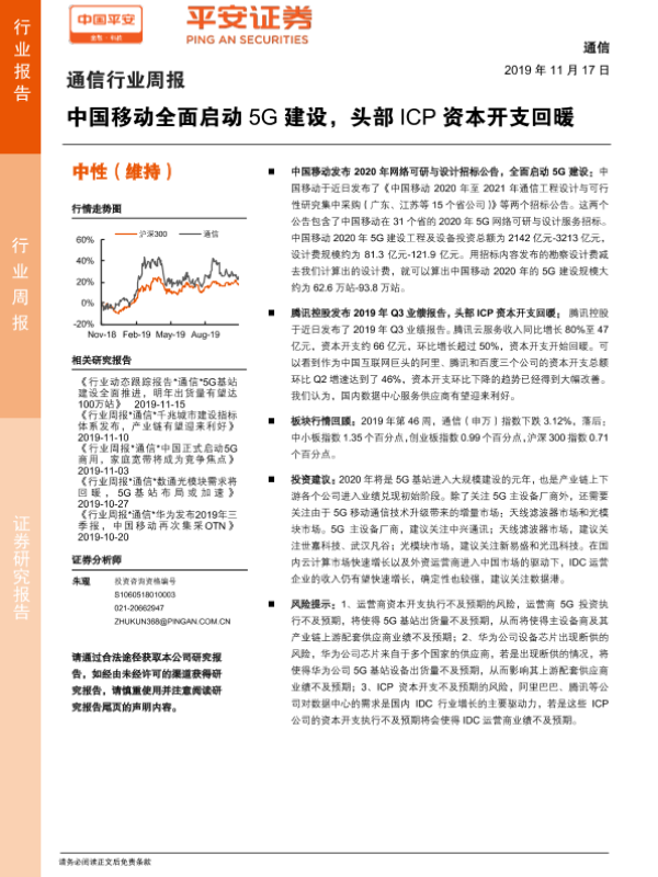 【平安证券】【20191117】20191117-平安证券-通信行业周报:中国移动全面启动5G建设,头部ICP资本开支回暖-5页 行业研究
