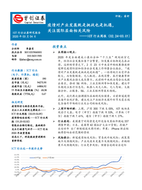 【首创证券】【20200304】20200304-首创证券-ICT行业周报:疫情对产业发展既是挑战也是机遇,关注国际层面相关风险-14页 行业研究