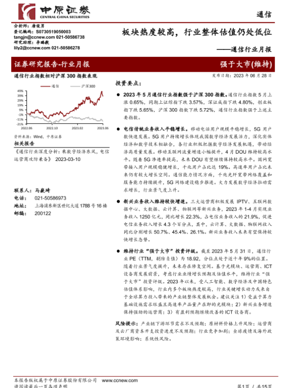 【中原证券】【20230628】通信行业月报:板块热度较高,行业整体估值仍处低位-15页 行业研究