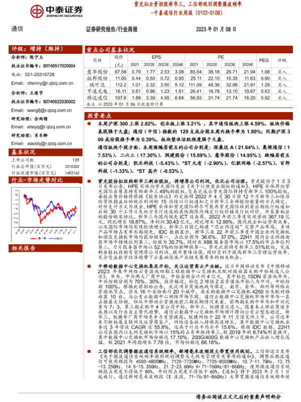 【中泰证券】【20230108】中泰证券-中泰通信行业周报:紫光拟全资控股新华三,工信部规划调整微波频率-22页 行业研究