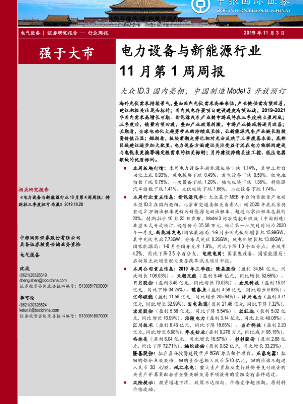 【中银证券】【20191103】电力设备与新能源行业11月第1周周报:大众ID.3国内亮相,中国制造Model 3开放预订-20页 行业研究