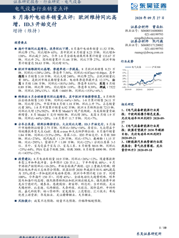 【东吴证券】【20200927】电气设备行业销量点评:8月海外电动车销量点评:欧洲维持同比高增,ID.3开始交付-10页 行业研究