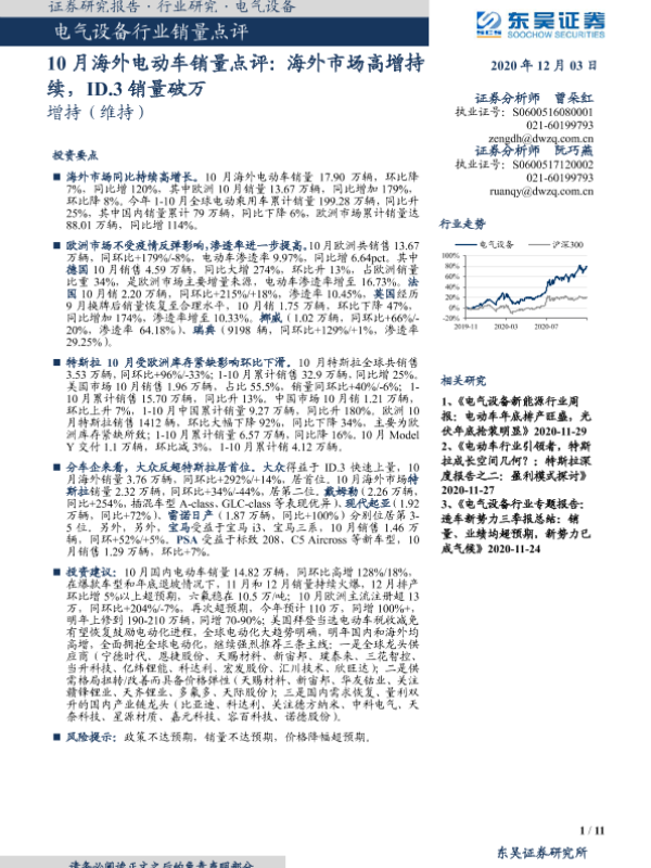【东吴证券】【20201203】10月海外电动车销量点评:海外市场高增持续,ID.3销量破万-11页 行业研究