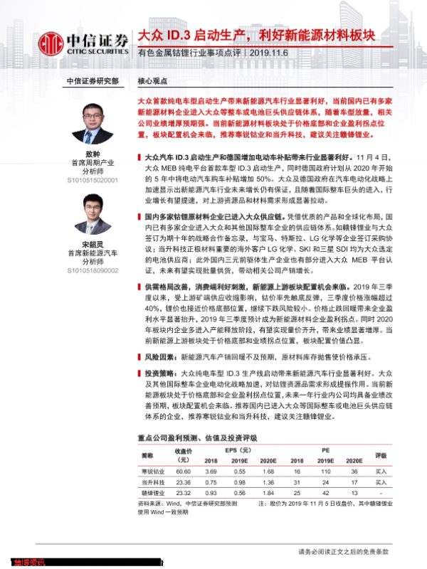 【中信证券】【20191106】大众ID.3启动生产,利好新能源材料板块-2页 行业研究