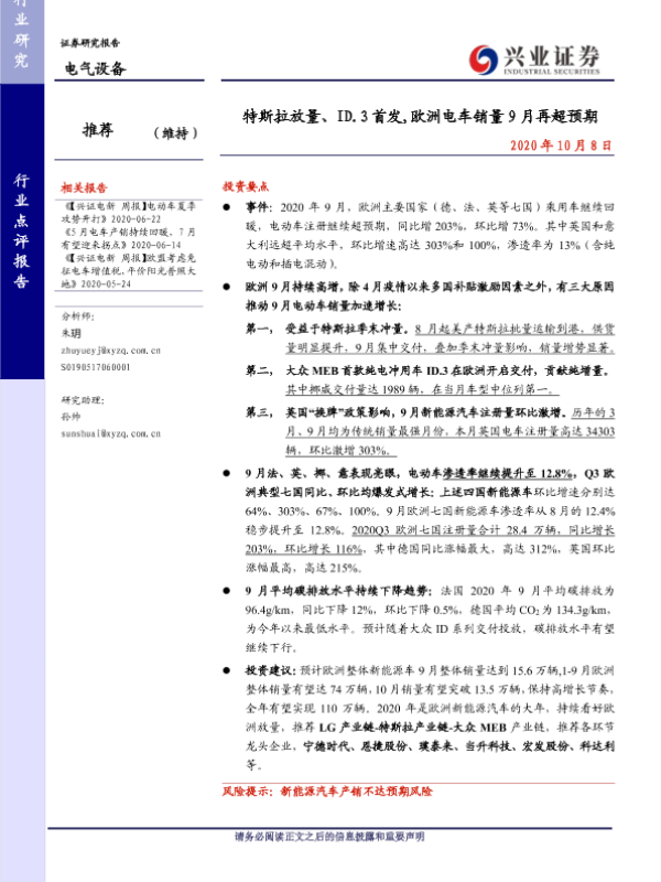 【兴业证券】【20201008】特斯拉放量、ID.3首发,欧洲电车销量9月再超预期-16页 行业研究