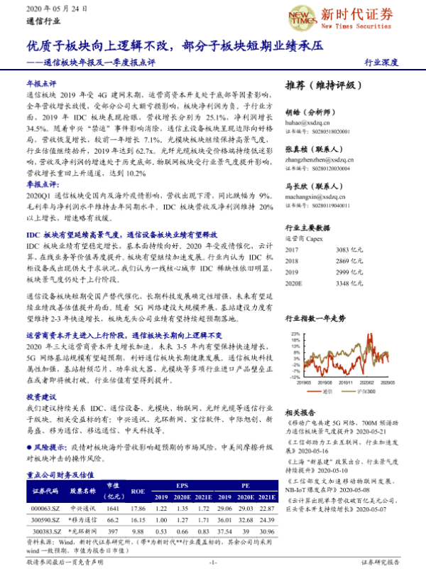 【新时代证券】【20200524】通信板块年报及一季度报点评:优质子板块向上逻辑不改,部分子板块短期业绩承压-32页 行业研究
