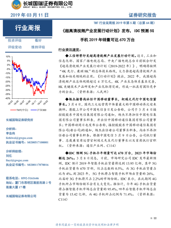 【长城国瑞证券】【20190311】日更新-长城国瑞证券-TMT行业双周报2019年第5期(总第64期):《超高清视频产业发展行动计划》发布,IDC预测5G手机2019年销量可达670万台-22页 行业研究