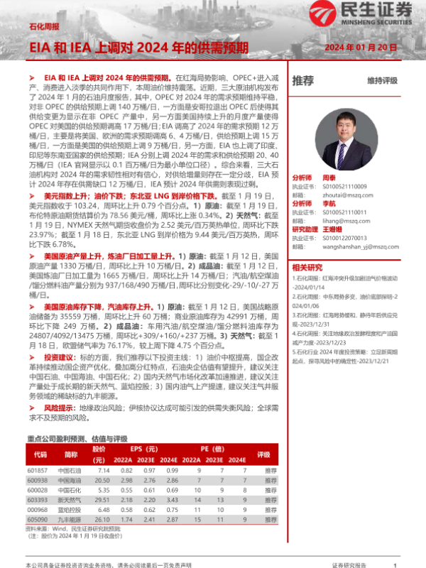 【民生证券】【20240120】石化周报:EIA和IEA上调对2024年的供需预期-29页 行业研究