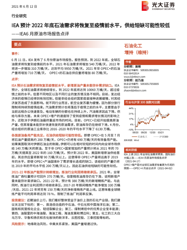 【光大证券】【20210612】IEA6月原油市场报告点评:IEA预计2022年底石油需求将恢复至疫情前水平,供给短缺可能性较低-2页 行业研究
