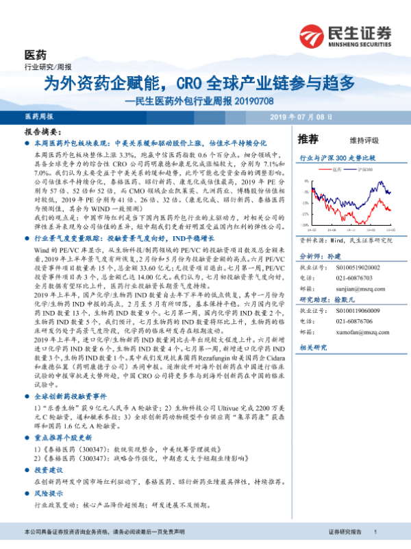 【民生证券】【20190729】医药外包行业周报:进口IND申报高景气,持续关注国际化进程-12页 行业研究