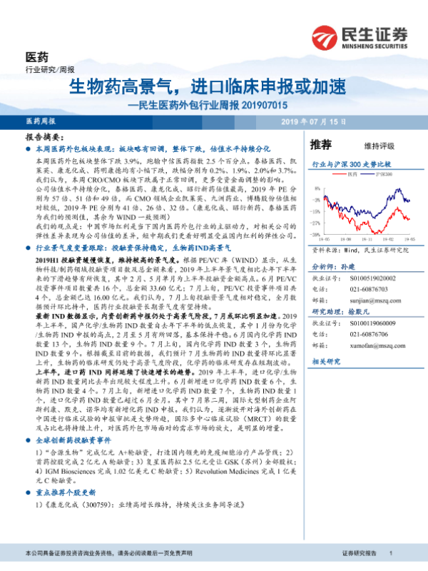 【民生证券】【20190715】医药外包行业周报:生物药高景气,进口临床申报或加速-13页 行业研究