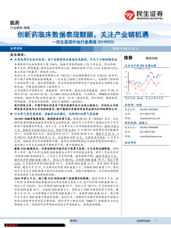【民生证券】【20190923】医药外包行业周报:创新药临床数据表现靓丽,关注产业链机遇-15页 行业研究