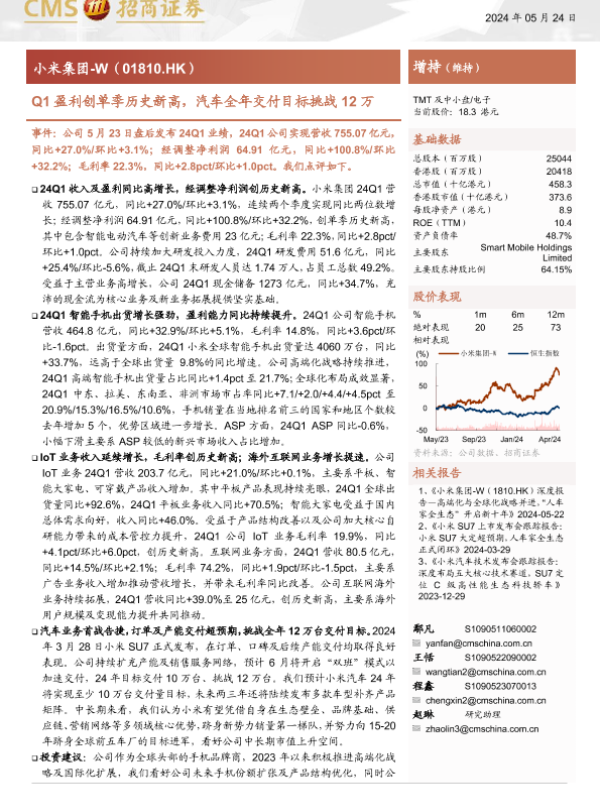 【海通证券】【20240524】小米集团-W(01810.HK)Q1盈利创单季历史新高,汽车全年交付目标挑战12万-10页 行业研究