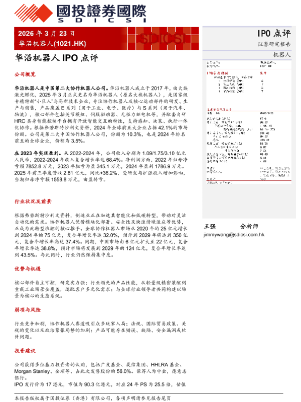 【国投证券(香港)有限公司】【202603】华沿机器人IPO点评-3页 证券期货研究报告