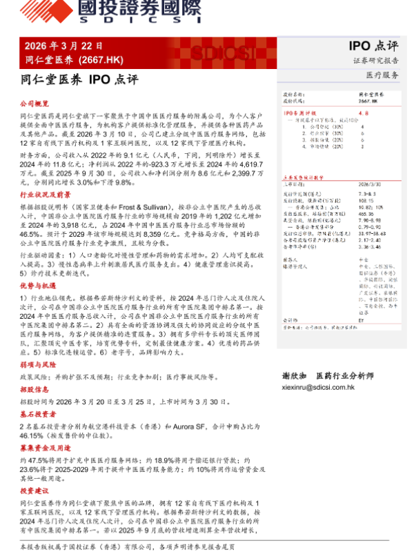 【国投证券(香港)有限公司】【202603】同仁堂医养 IPO点评-3页 证券期货研究报告
