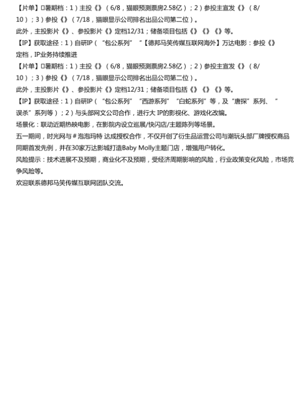 【德邦证券】【2023】德邦马笑传媒互联网海外万达电影参投定档IP业务持续推进-1页 行业研究