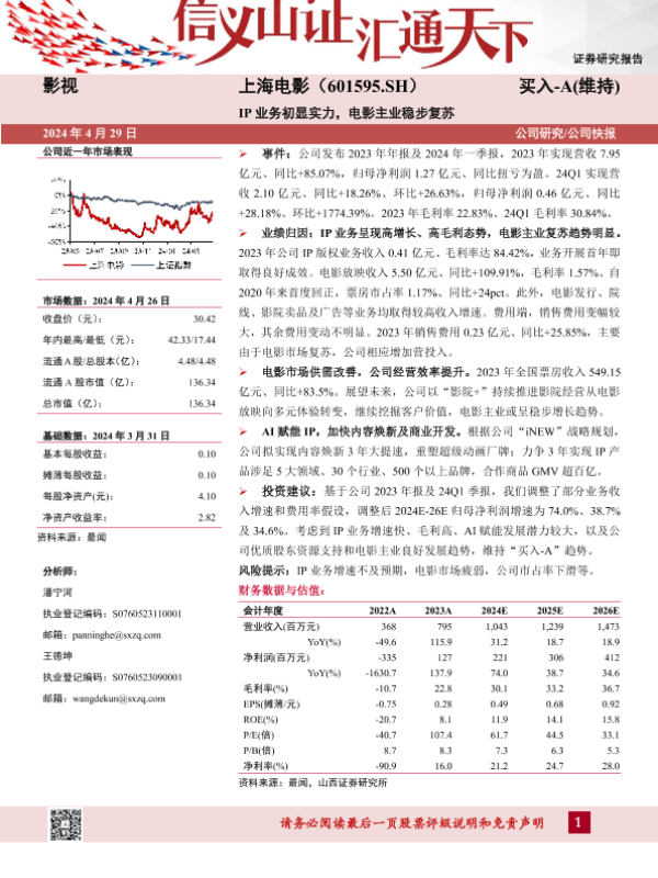 【山西证券】【20240429】IP业务初显实力,电影主业稳步复苏-4页 行业研究