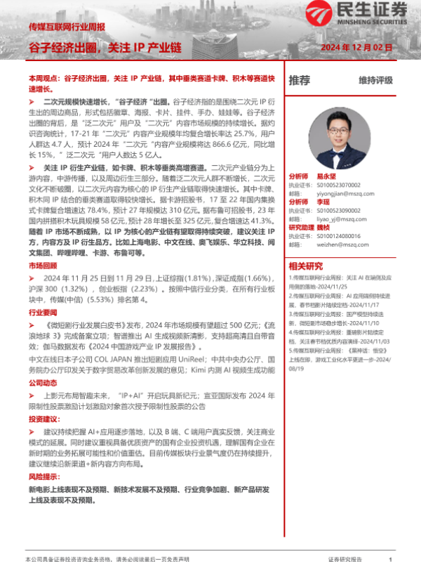【民生证券】【20241202】传媒互联网行业周报:谷子经济出圈,关注IP产业链-16页 行业研究