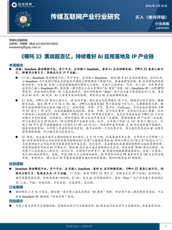 【国金证券】【20250216】传媒互联网产业行业周报:《哪吒2》票房超百亿,持续看好AI应用落地及IP产业链-10页 行业研究