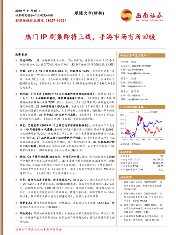 【西南证券】【20191103】影视传媒行业周报:热门IP剧集即将上线,手游市场有所回暖-15页 行业研究