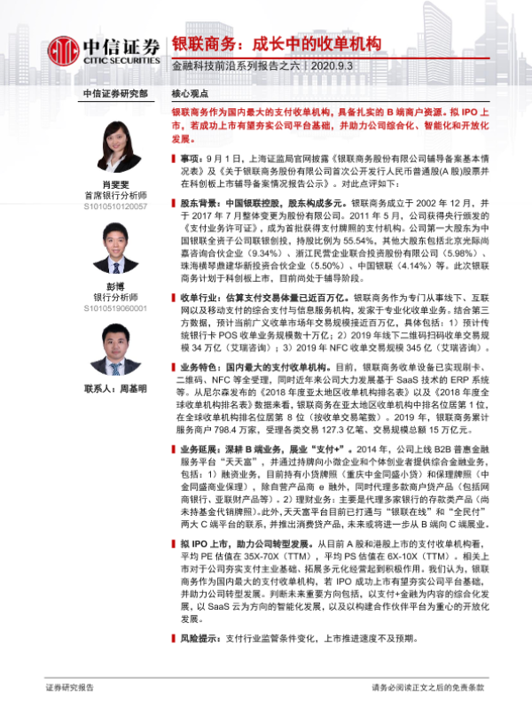 【中信证券】【20200903】银联商务:成长中的收单机构-4页 行业研究