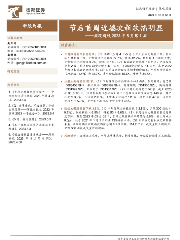 【德邦证券】【20230506】周观新股2023年5月第1周:节后首周近端次新跌幅明显-20页 行业研究